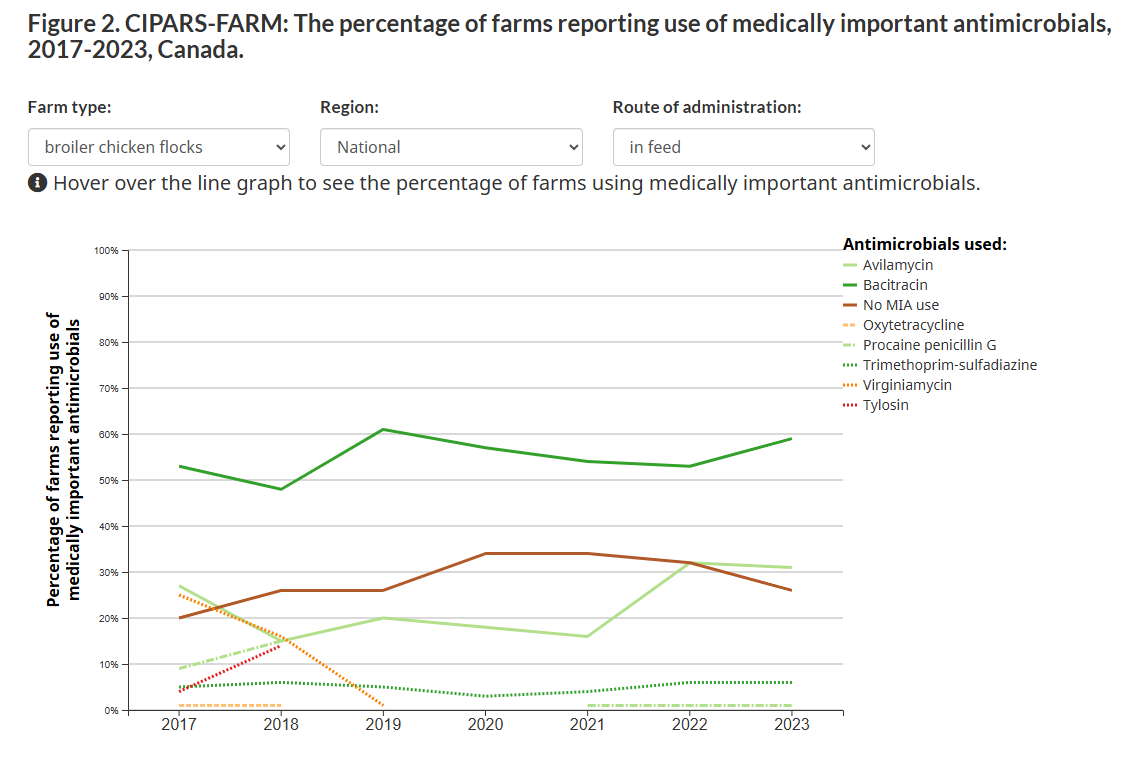 CIPARS reports that ~60% of antimicrobials used are not important to human medicine1. The graph above shows the percentage of flocks, as a national average, that reported medically important antimicrobials (Category I, II, or III) used in feed. Bacitracin (BMD) has consistently been the most frequently reported, and in 2023, Avilamycin (Surmax) was used in just over 30% of farms sampled. About 27% of flocks surveyed reported no use of Category I, II, or III antibiotics.