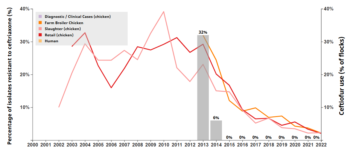 CIPARS has demonstrated reductions in antimicrobial resistance in targeted bacteria and has pointed to CFC’s Responsible AMU Strategy as a major factor for this reduction2. The graph below shows the success of the 2014 elimination of the preventive use of Category I antibiotics (usage is at 0% after 2014), and the correlation with decreasing levels of resistance in E.Coli isolates.