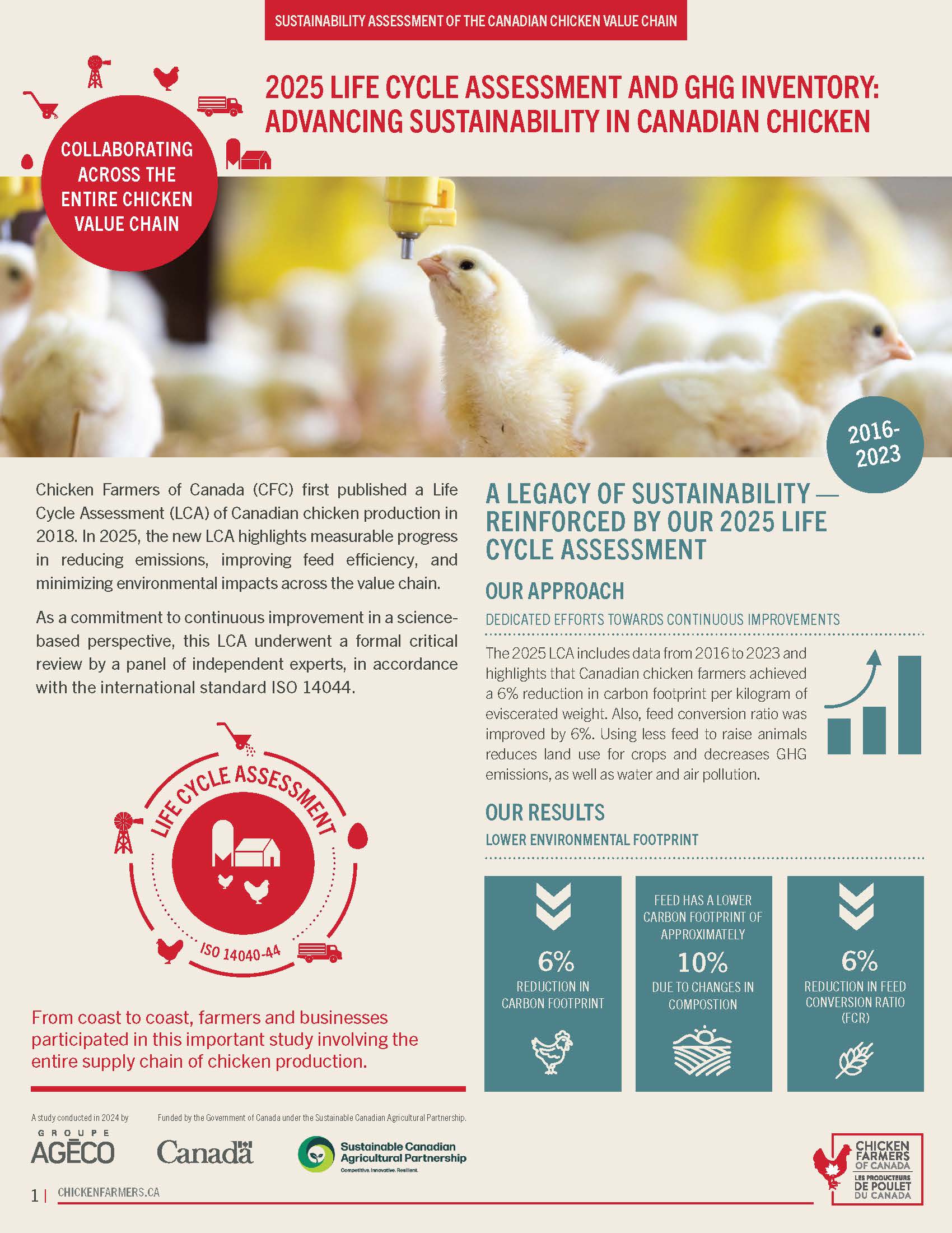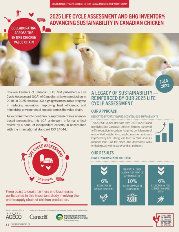 The latest LCA was conducted once again by Groupe AGÉCO, a consultation firm specializing in corporate social responsibility and economic studies. The study was designed to measure the environmental and social performance of Canada’s chicken sector, from hatching egg to processor.
